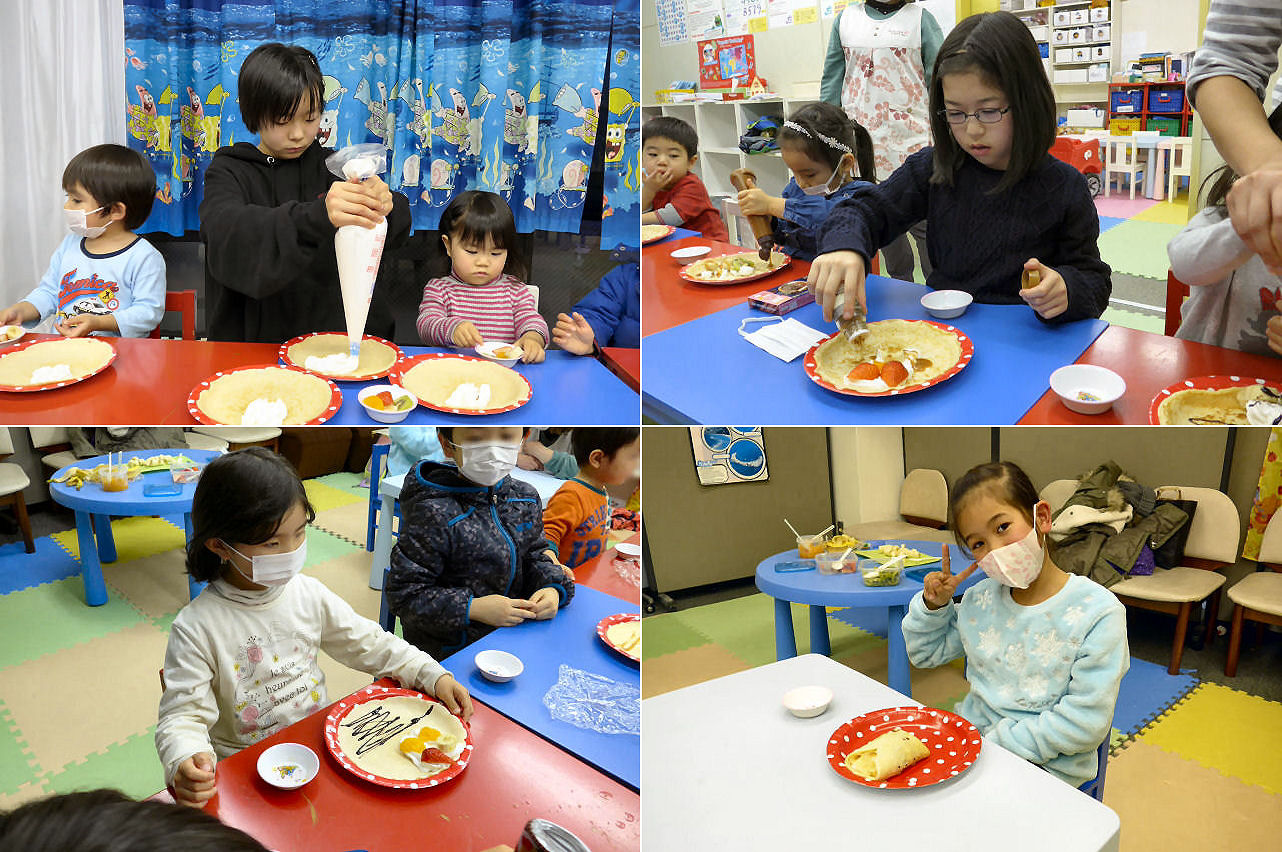 あいにく、この日は体調を崩して お休みしてしまうキッズが多かったのですが(皆さんも体調管理を怠りなく!)、参加したキッズは思い思いにクレープ作りを楽しんでいました。ホイップクリームを乗せ、選んだ果物を乗せ、お好みのソースをかけて 折り畳みます。