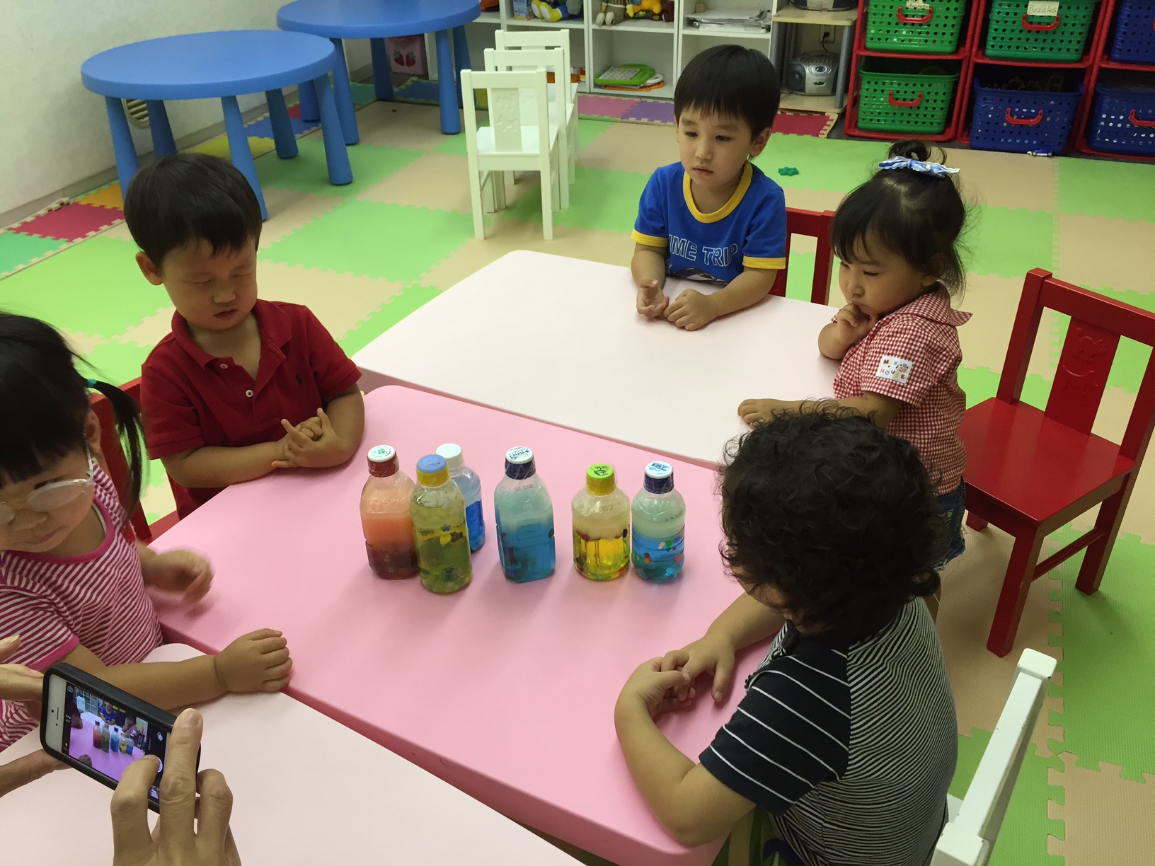 小さい子たちは指を上手に使い飾りを一生懸命ボトルに入れました。