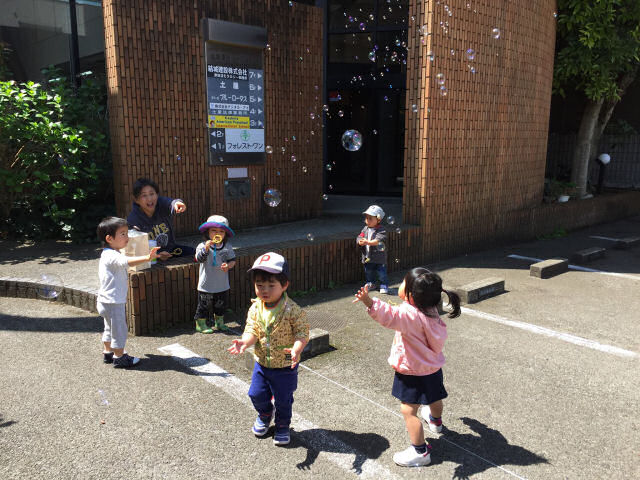 今日の外遊びはシャボン玉。シャボン玉自体は薄い2層に分かれており、夫々が別の波長の太陽光を反射し、それが混ざり合って・・・いや、難しいことは さておき、ともかく太陽光に照らされたシャボン玉が七色に光ります。本格的な春の到来を感じる瞬間でした。
