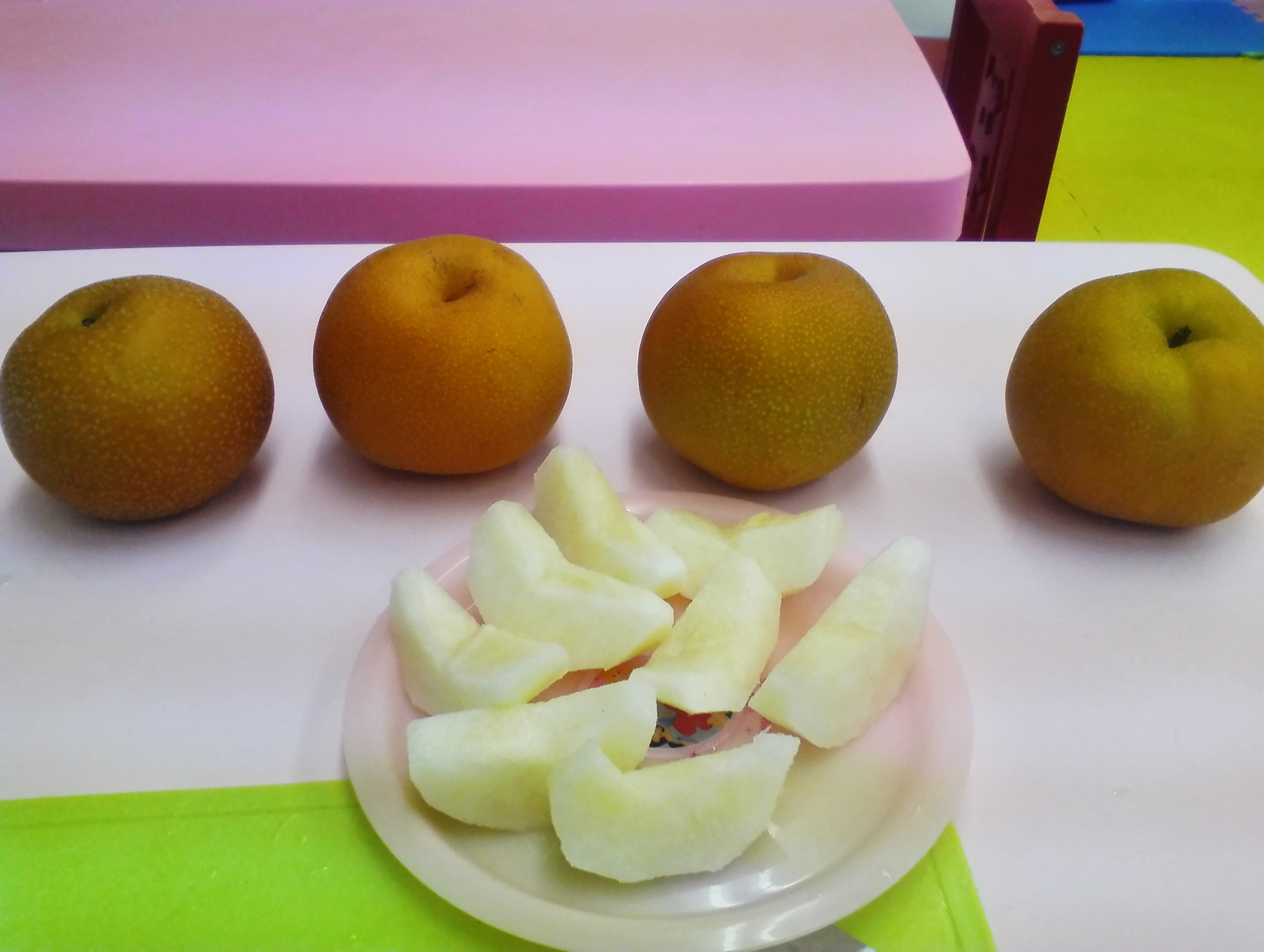 笑顔のパパさんママさんさんが『今、梨狩りに行ってきたんです。これ皆さんでどうぞ!』と、取れたてフレッシュ梨を頂きました!