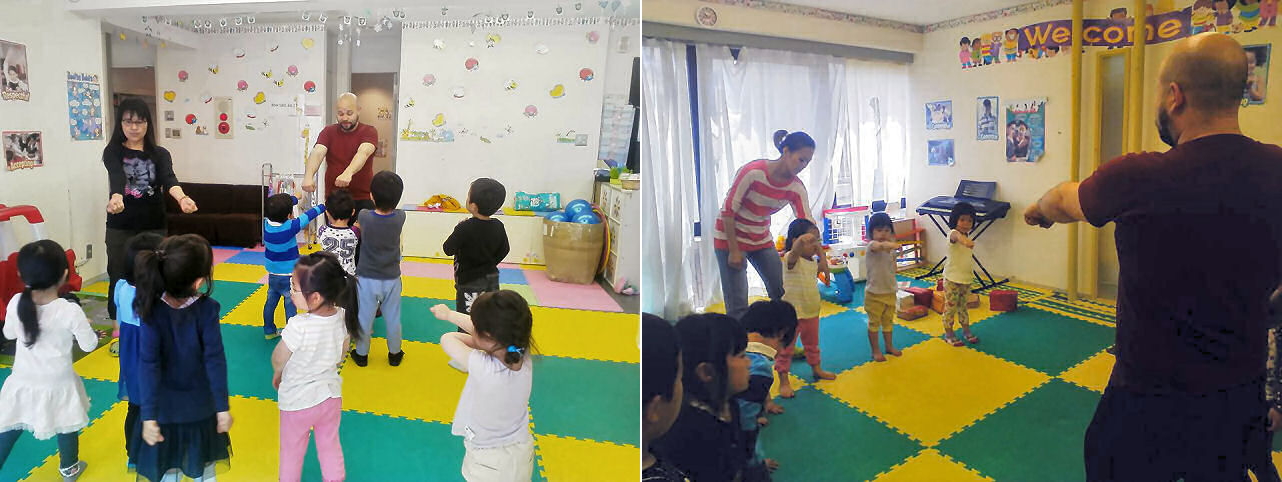とあるスタッフは複数の言語を操るだけでなく、文化・運動の面でも多才です。彼は英語の授業の他に音楽も担当していますが、今日は実験的な意味合いも込め、みんなで空手に挑戦。