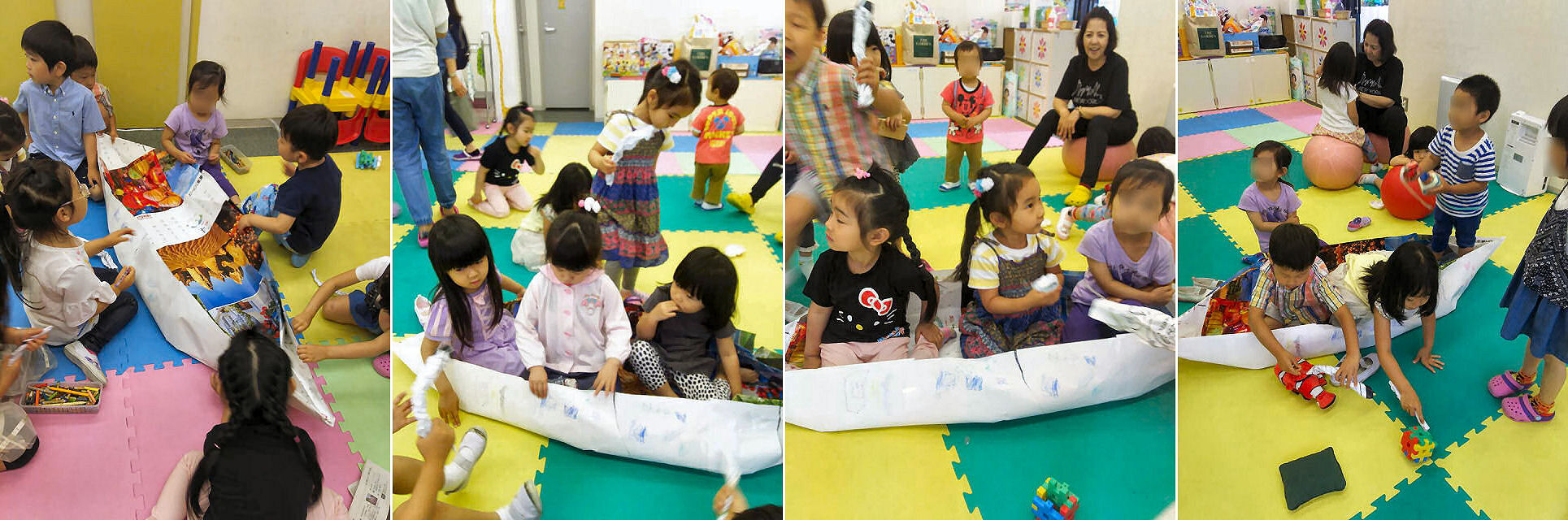 材料は使い終わった暦。これらを貼り合わせていきます。紙を押さえてくれる人。テープを貼る人。折り紙の得意なキッズが紙の折り方を指示。3・2・1で ヨッコラセと ひっくり返します。完成したボートを破らないようにそっと、みんなでプレイルームへ運びました。エクササイズの時間に学んだ「チームプレイ」が ここで発揮されました。みんな、学んだことを ちゃんと覚えて実践してくれていますね。