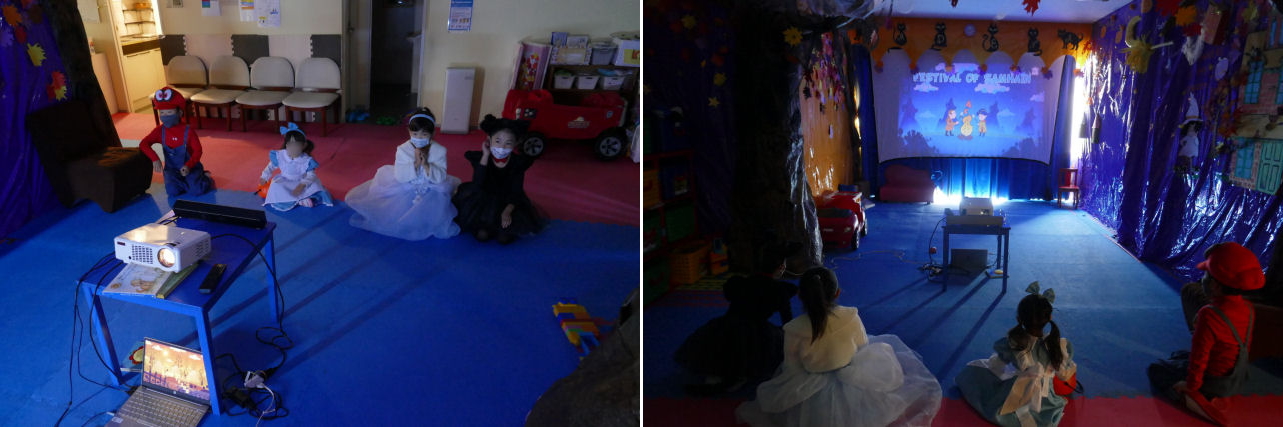 映画鑑賞会1作品目はハロウィーンの歴史について。勿論、本編は全て英語で、邪魔くさい日本語字幕は無しです。ハロウィーンの発祥はアイルランド。ジャコランタンはカブやジャガイモで作られていましたが、その風習が米国に伝わった際、ジャコランタン作りにカボチャが用いられるようになり、それが世間一般に広がりました。・・・という内容、キッズは ちゃんと理解できていたかな!?