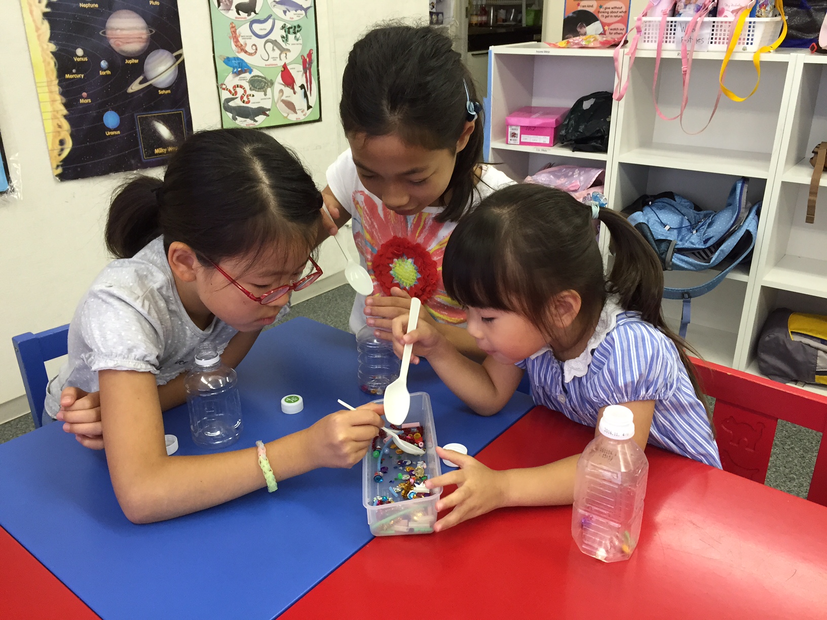 大きい子たちはスプーンを使い 飾りをボトルに入れました。